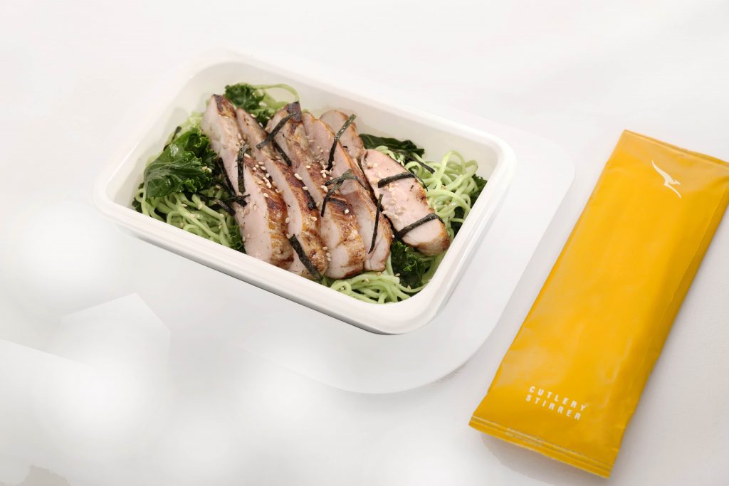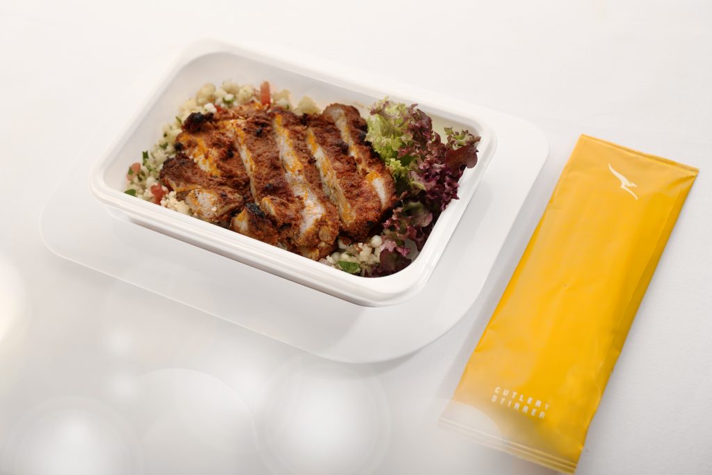 And there’s more choice – rather than the normal two options, Qantas offers three. That includes dishes like Teriyaki chicken with soba noodles, kale and miso dressing. Or a salad of tandoori chicken with mixed couscous and lemon vinegarette. And if three choices aren’t enough, passengers can even pre-order a fourth option through the Q-Select option.
