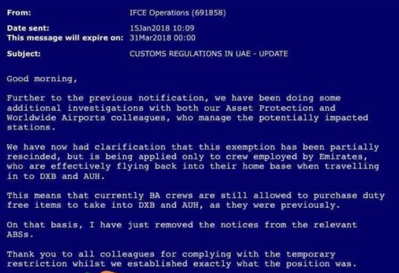 But Dubai’s Duty-Free allowance for tourists and residents alike is actually quite generous and many cabin crew took advantage. That was until Emirates issued an instruction, informing cabin crew that the UAE’s customs authorities had imposed a ban on the practice.