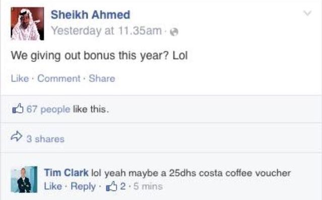 The post is started off by Sheikh Ahmed bin Saeed Al Maktoum who asks “(are) we giving out a bonus this year? lol”. Tim Clark, the airline’s President replies by suggesting that staff could make do with a 25AED Costa Coffee voucher – After all, the Emirates Group does own the UAE franchise for the popular British coffee shop.