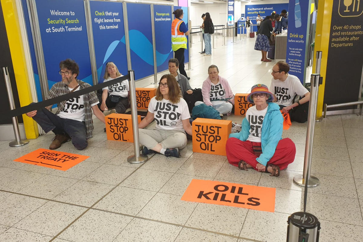 A group of protestors from the ‘Just Stop Oil’ protest movement attempted to disrupt Gatwick Airport on Monday morning by blocking the the main security control point in the South Terminal by sitting in front of the entrance with so-called ‘lock on’ devices.
