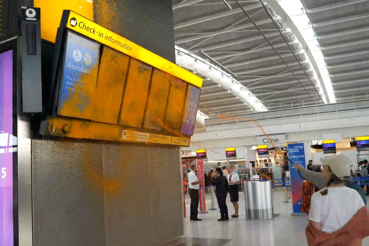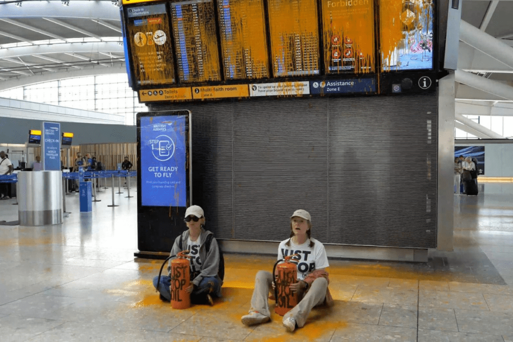 At least two environmental protestors from the direct action group ‘Just Stop Oil’ have been arrested after they sprayed orange paint on the departure boards, windows, and the floor of Terminal 5 at Heathrow Airport on Tuesday morning.