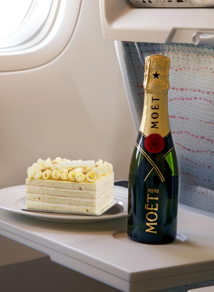 And what better event than Valentines Day? The Hallmark day of the year, loved by florists, jewellers and card makers. For just $43 USD, Emirates will now sell you a vanilla or chocolate cake accompanied by a 200ml bottle of Moët et Chandon Brut NV – available for Valentine’s day only.