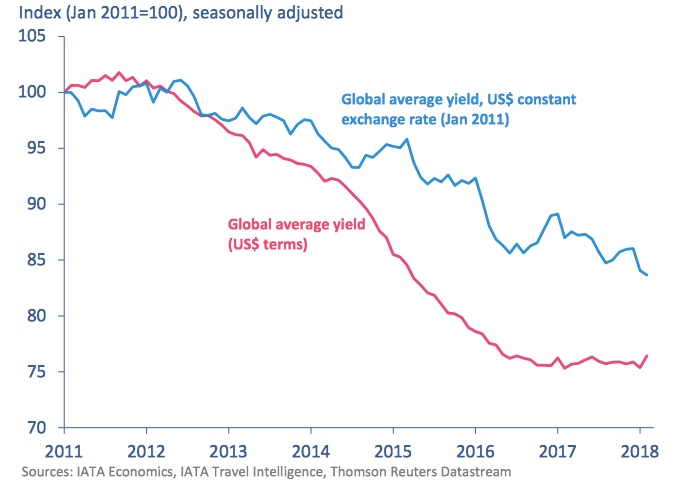 Take passenger yields as a great example – that’s the amount of money an airline makes out of each passenger. IATA says February saw the strongest month-on-month rise in yields for at least seven years but longterm figures (just take a look the graph below) just goes to show how much yields have dropped in the last few years.