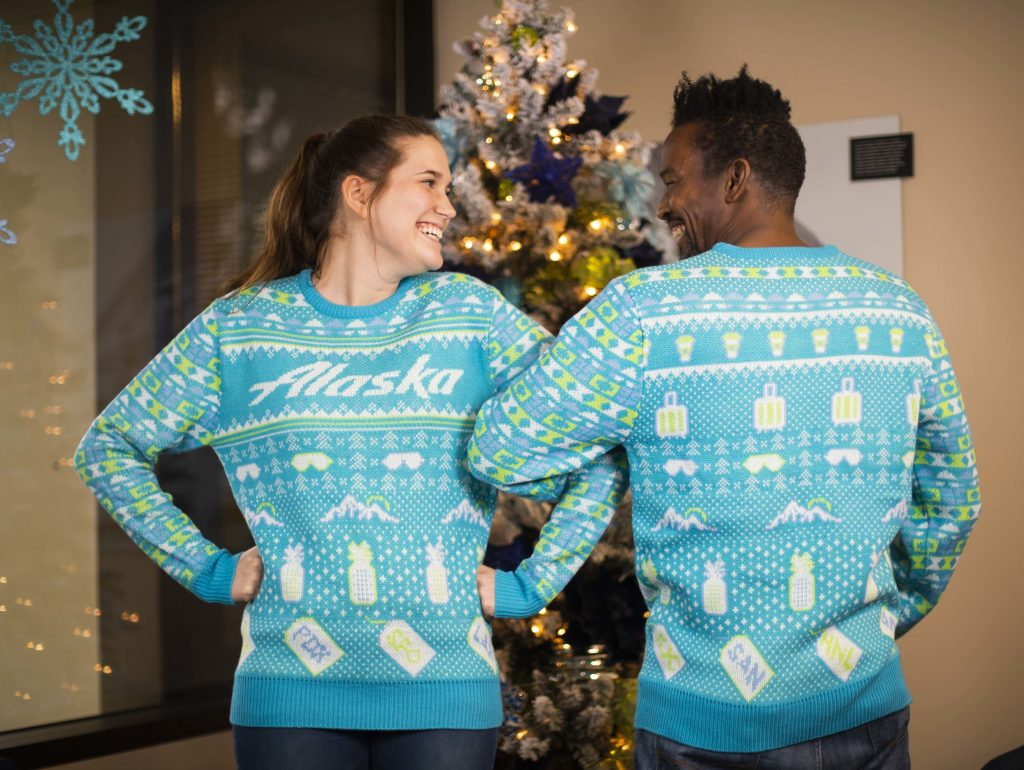 The promotion (which runs for one day only) is to mark the annual National Ugly Holiday Sweater Day – it’s the second year Alaska Airlines has celebrated the one-day event but festive holiday-themed boarding music and free holiday movies will play all month.