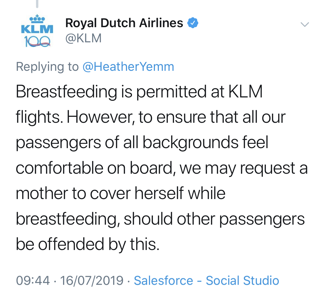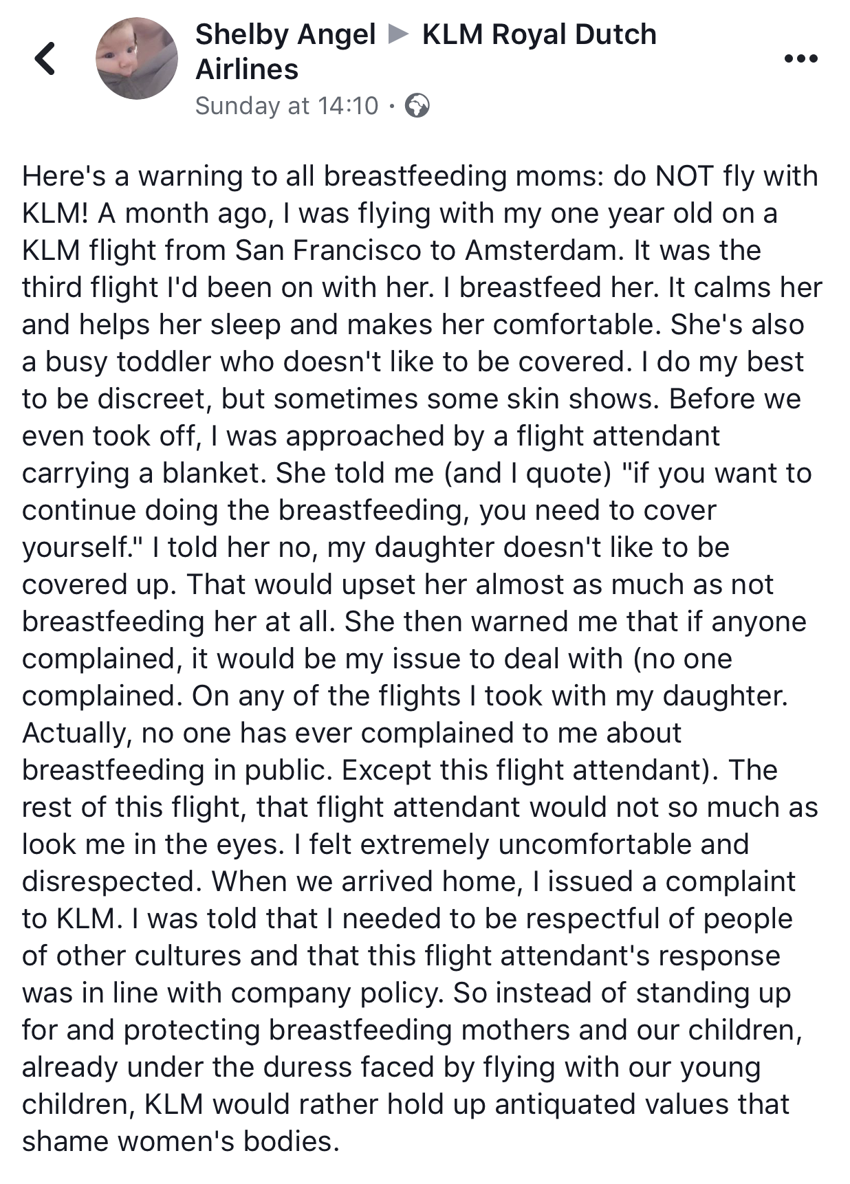 KLM told Shelby that the cabin attendant had in fact been acting in accordance with company policy. When others then contacted KLM to confirm it’s policy, a spokesperson again said they “may request a mother to cover herself while breastfeeding, should other passengers be offended by this.”