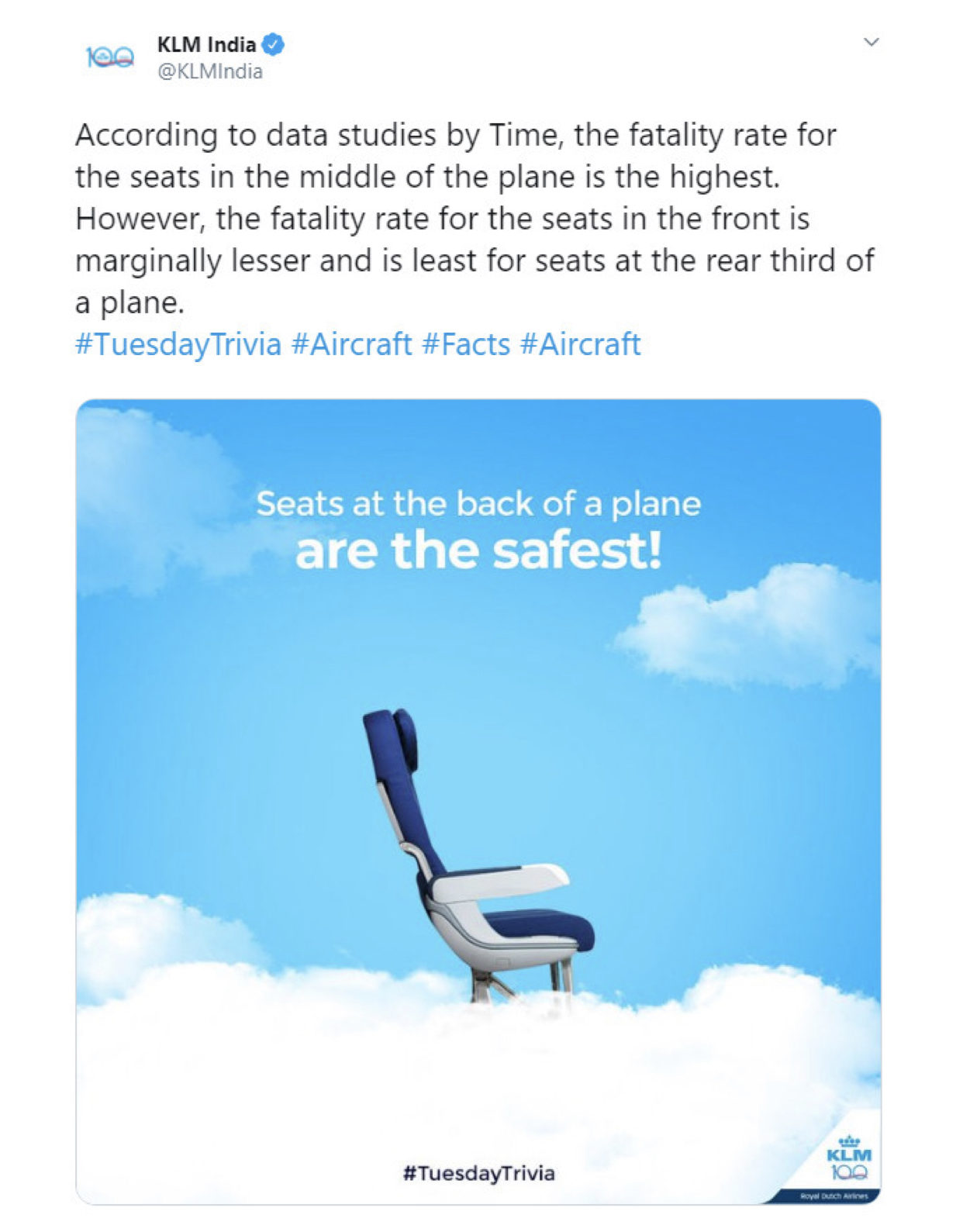 Luckily, KLM India reassured its followers that sitting at the back of the plane is the safest place to be, while passengers sat up front are “marginally” safer. Hardly the kind of content you would expect an airline to be producing – could you imagine a car manufacturer revealing the least safe cars in their range?
