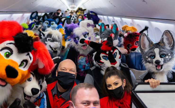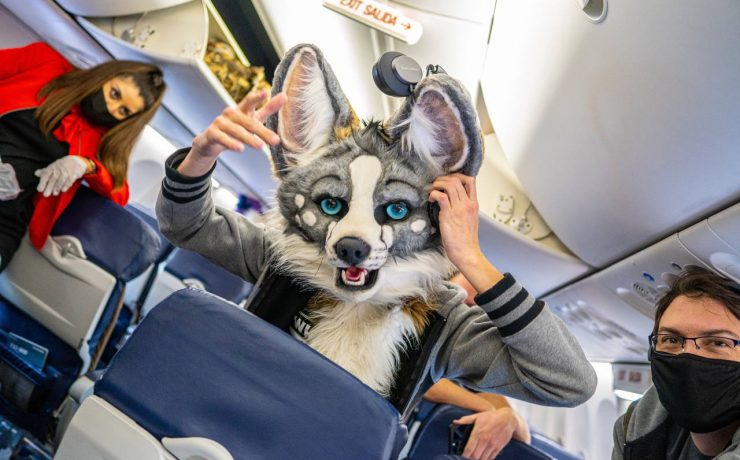 A Southwest Airlines flight from Reno to Denver was taken over by a group of animal costume-wearing passengers who are collectively known as furries. The flight attendants and pilots onboard Southwest flight WN1212 took the situation in their stride, even stopping to pose with the furry community while other passengers – known as normies – looked on.
