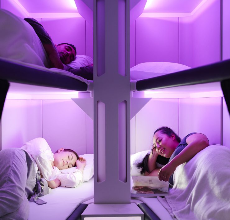 And when the Kiwi flag carrier takes delivery of new 787-9 Dreamliners in 2024, they will come fitted out with the world’s first Skynest. The pods will sit close to the back of the Economy cabin with three bunk beds on either side of a central entrance.