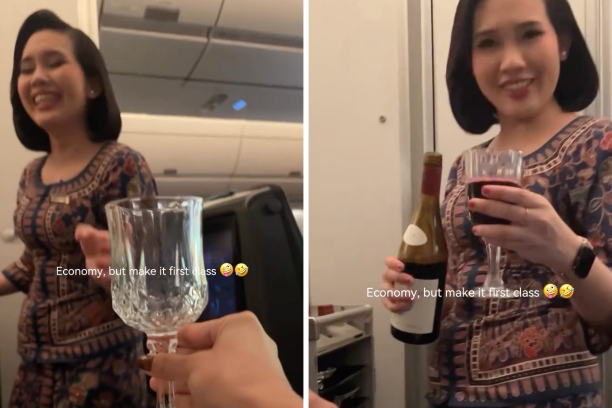 Captioned ‘Economy, but make it First Class, ‘ the short video post shows Jenifer handing over the ornate crystal wine glass to an obviously bemused flight attendant aboard a Singapore Airlines plane in Economy Class.