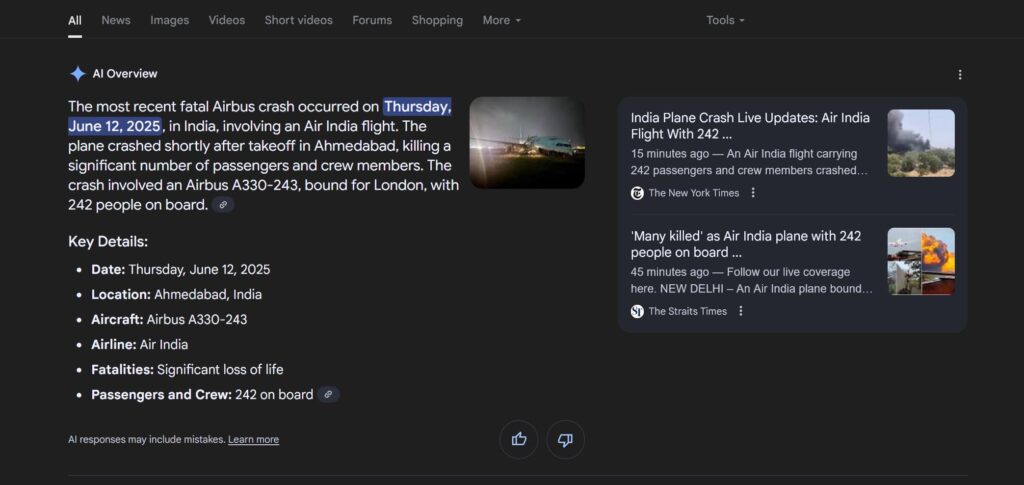 As is often the case when users spot an error in AI Overviews, it appears that Google has manually displayed its AI response for queries involving the Air India plane crash.
