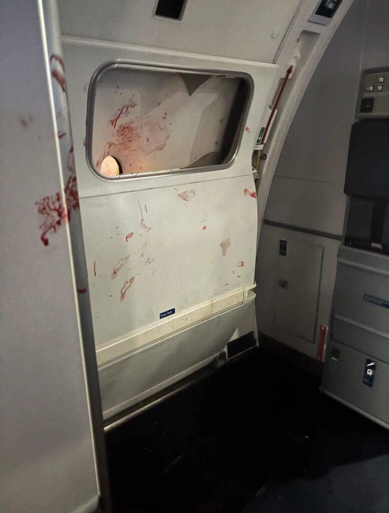 An unruly passenger on a recent Delta Air Lines flight from Minneapolis–Saint Paul to Honolulu, Hawaii, left the plane looking like a gruesome crime scene after smashing up a door and cutting himself on reinforced glass.