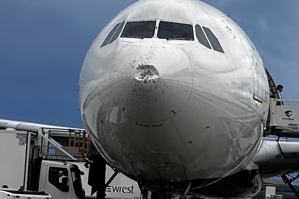 Eyewitnesses shared photos on social media of the damage caused to the front of the Airbus A330 long-haul aircraft, with a large dent and hail damage across the nose of the nine-year-old plane.
