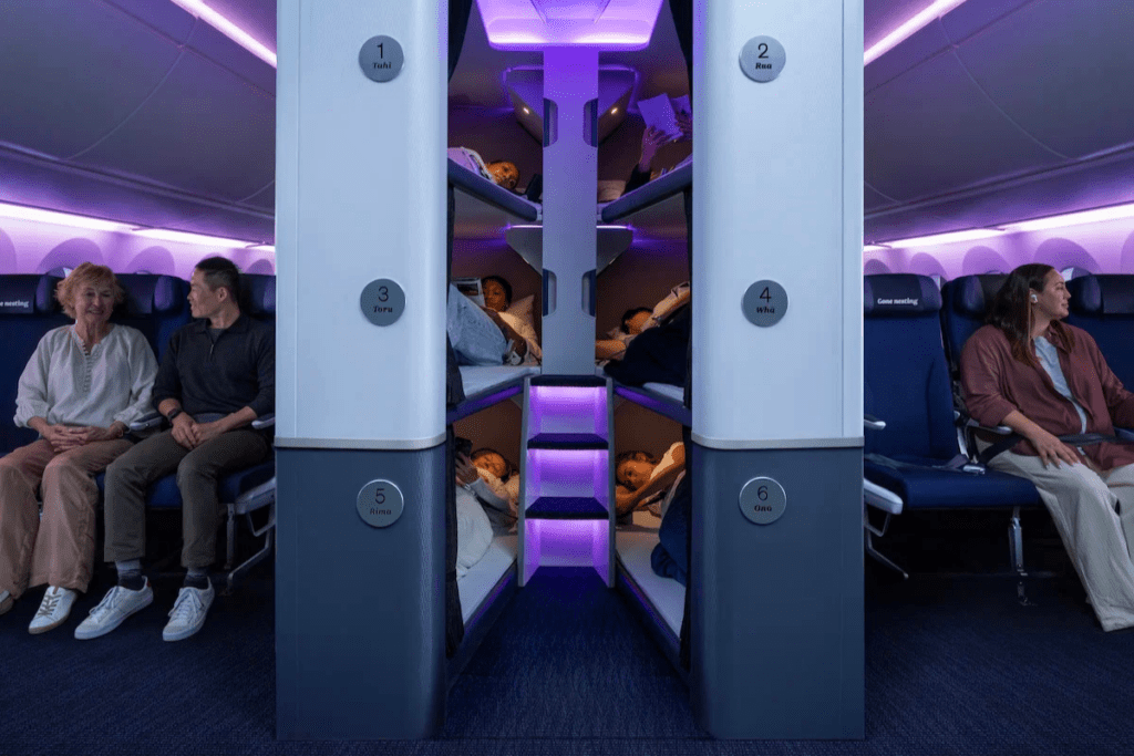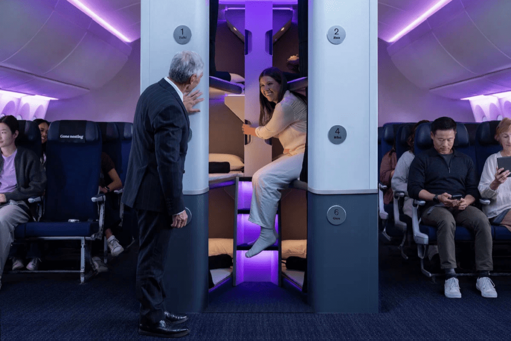 Dubbed ‘Skynest,’ the bunk bed concept was conceived after three years of research and development at Air New Zealand’s innovation center in Auckland and first unveiled to the world in early 2020.